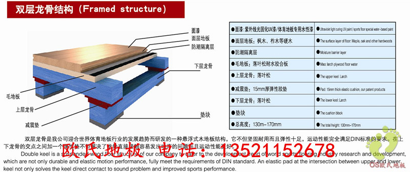2、雙層龍骨結構:此結構的體育木地板由于雙交叉鋪設,達到了理想的高度,所以整體結構的穩定性和沖擊吸收效果是*好的。主要應用于專業籃球比賽,比賽很激烈,對體育地板的性能要求很高。例如:籃球聯賽等。